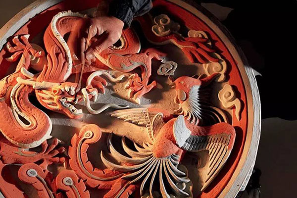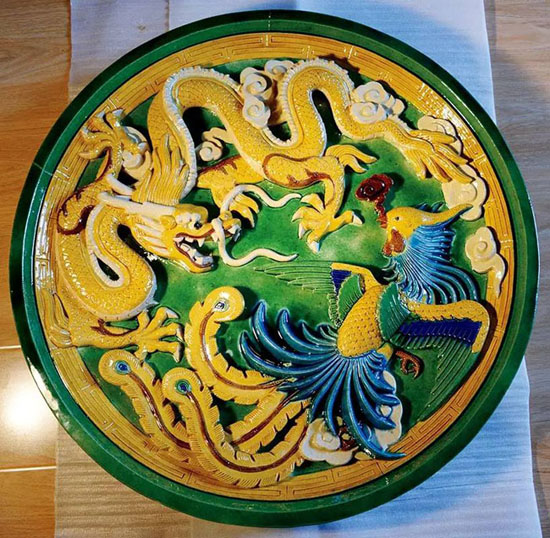 琉璃制品中,常常會(huì)有用于影壁等處的大型裝飾構(gòu)件。這張龍鳳大盤(pán)工藝精致,用色多達(dá)七種,有龍身的黃、背景的綠、靈芝的紫、祥云的白、鳳翅羽的藍(lán)、鳳頸的孔雀藍(lán)、鳳眼的黑。最奇妙的是,施釉前的顏色(上圖)與燒成的顏色(下圖)完全不同,讓人對(duì)傳統(tǒng)工藝的神奇變化油然而生敬佩之心。